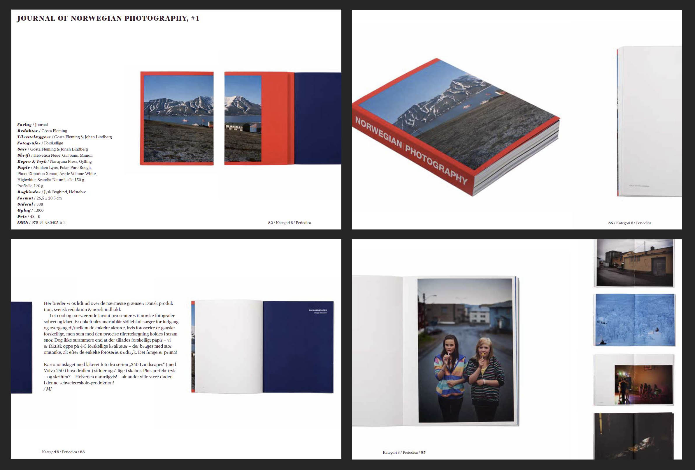 «…vi er faktisk oppe på 4 – 5 forskjellige (papir)kvaliteter – som brukes med stor omtanke, alt etter de enkelte fotoseriers uttrykk. Det fungerer prima! Kartongomslaget med lakkert foto fra serien «240 Landscapes» (med Volvo 240 i hovedrollen) er også midt i blinken.»